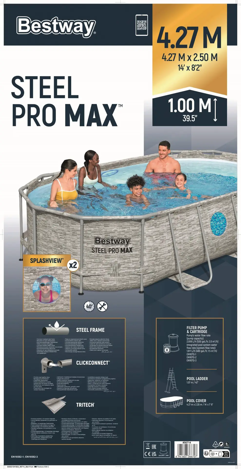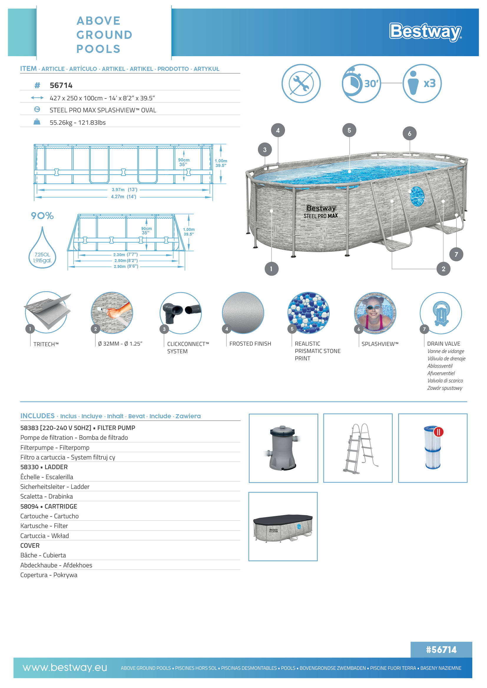 בריכת אולטרה אובלית עם חלונות דגם חדש 2026 במידות 427X250 גבה 1 מ' מק"ט 56714 כולל: משאבת פילטר 530 גלון, סולם וכיסוי. יבואן רשמי BESTWAY